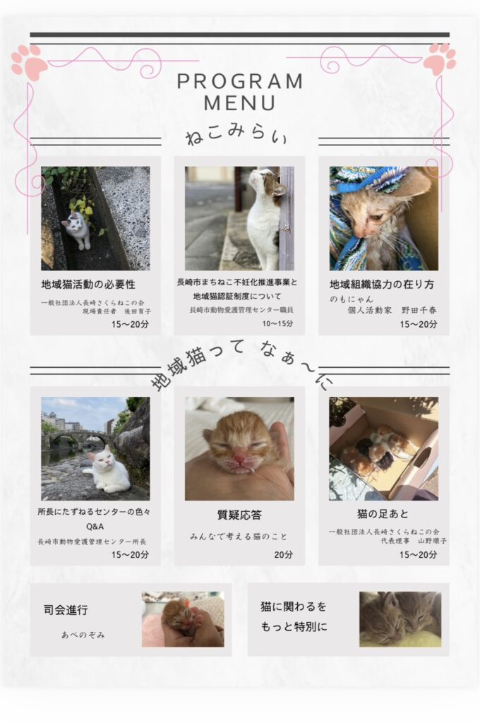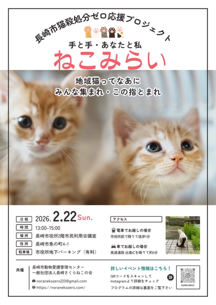 長崎さくらねこの会では、長崎市動物愛護管理センターと共催で野良猫のことについて考える講演会『地域猫ってなぁ〜に』を2026年2月22日、長崎市役所2階・市民利用会議室で開催します。